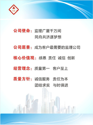 公司始終堅持“質量優(yōu)先、客戶至上”的經營理念,遵照“誠信服務、責任為本、團結求實、與時俱進”的質量方針,不斷加強企業(yè)內部管理,力爭為社會提供更加全面周到的建設監(jiān)理服務。